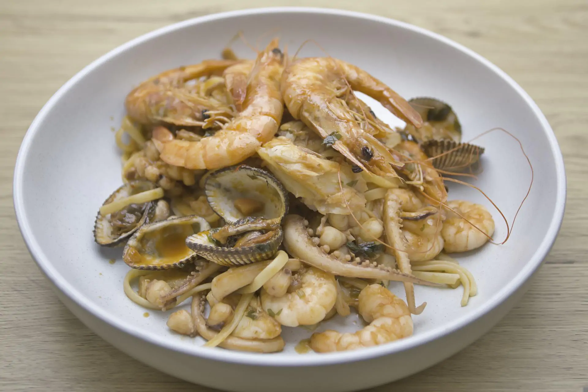 Scalda 2 spicchi d’aglio in 100 ml di olio a fuoco basso per 5 minuti, prima di mescolarli con 400 gr di spaghettoni già lessati. Inforna il tutto per 15 minuti a 180° e mettili da parte. Metti in ammollo 200 gr di vongole veraci dentro dell’acqua salata, il tempo di rosolare 8 gamberi in padella. Dopodiché scolale. Soffriggi 400 gr di cubetti di seppia, aggiungendo 1 peperone verde e 2 agli tritati, Dopo cinque minuti, aggiungi 2 cucchiai di salsa di pomodoro, e continua a cuocere per altri cinque minuti, a fuoco basso. Aggiungi le vongole e gli spaghettoni che hai messo da parte, aggiusta un po’ di sale e versa 1,2 l di brodo di pesce caldo. Cuoci il tutto per 5 minuti a fuoco basso prima di aggiungere i gamberi. Inforna il tutto per 10 minuti a 180°, finché il brodo non verrà assorbito.