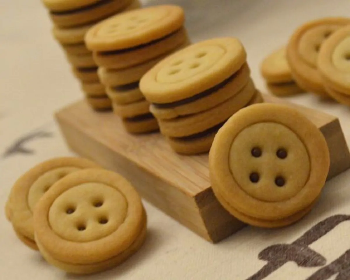 - Trascorso il tempo necessario, riprendiamo la pasta frolla e stendiamola con il mattarello fino a uno spessore di circa 5 mm. Con un coppapasta di 4-5 cm di diametro ricaviamo un numero pari di dischi che andranno in seguito accoppiati. Trasferiamoli su una leccarda rivestita con carta forno e con un coppapasta più piccolo incidiamone metà (le parti superiori dei biscotti), per creare un bordo decorativo, e con una cannuccia ricaviamo 5 forellini.