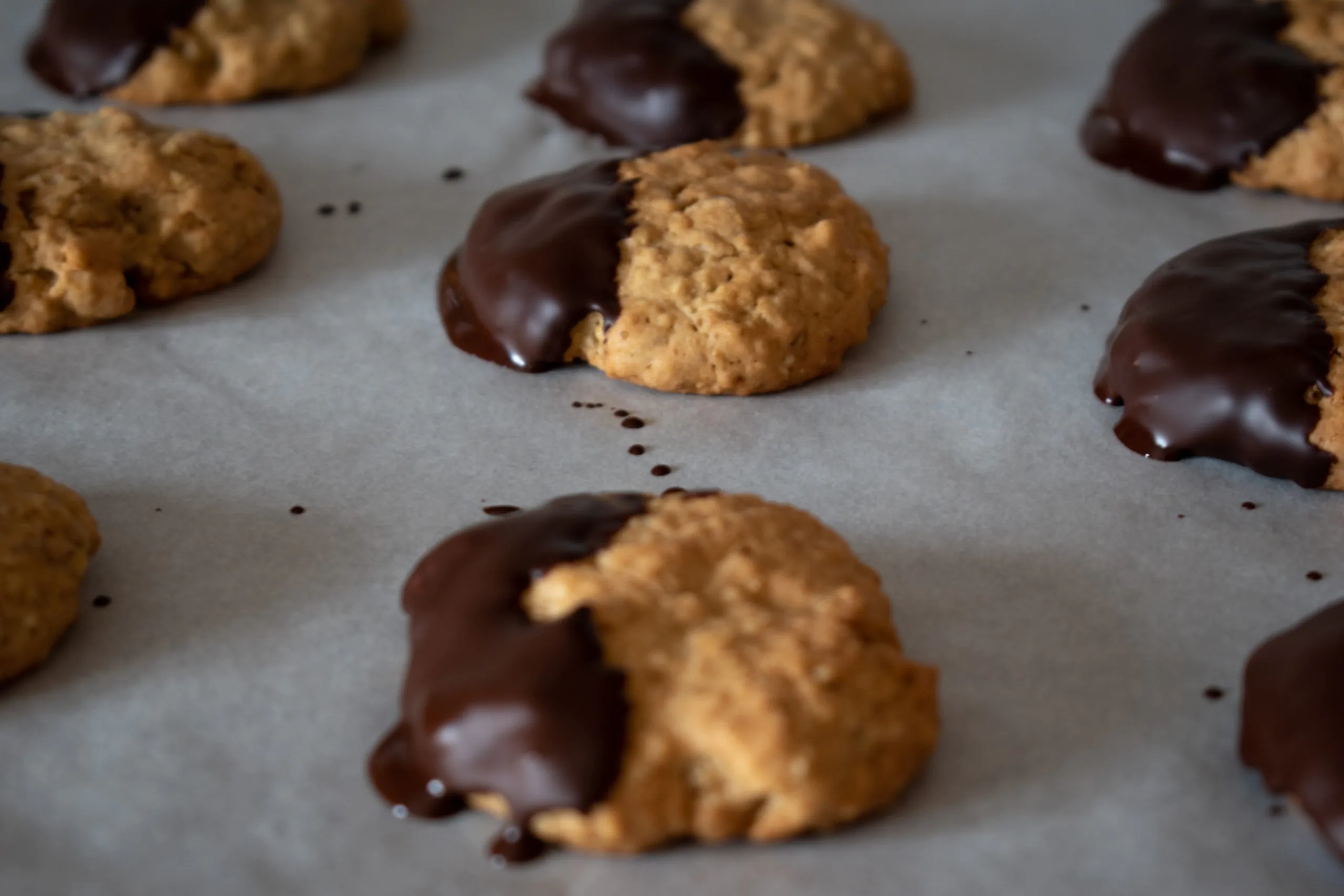 5. Sciogliete del cioccolato fondente a bagnomaria e intingetevi i biscotti all’arancia, dopodiché adagiateli sopra una gratella e attendete che la glassa si solidifichi completamente.