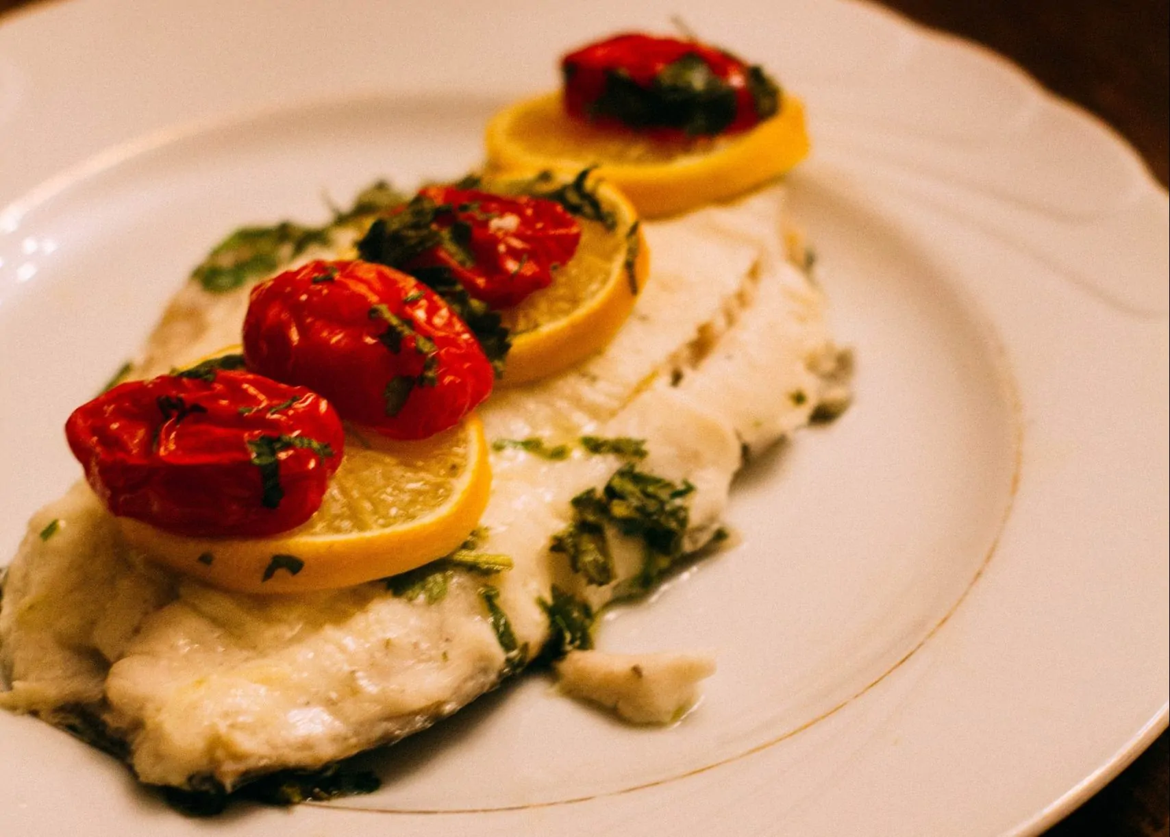 - Disporre i filetti di pesce in cima e spargere le olive. Mettete un paio di fette di limone sopra il pesce e irrorate con l’olio rimanente. Arrostire per altri 7-8 minuti fino a quando il pesce è cotto.