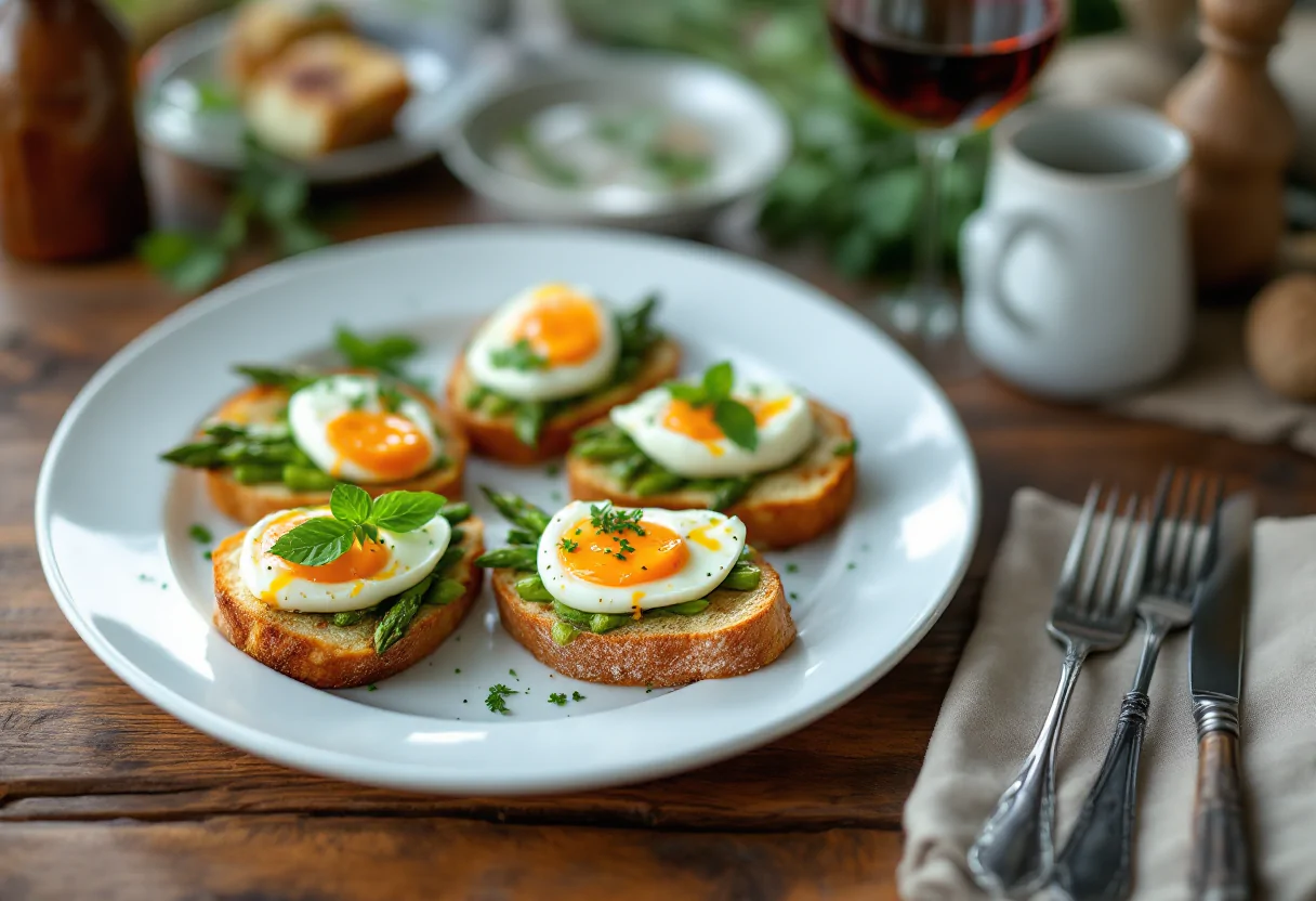 Scopri il gusto unico delle bruschette gourmet con asparagi e uova morbide.