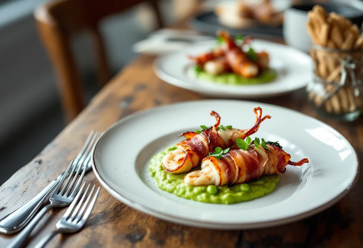 Un delizioso secondo piatto estivo: calamaro con pancetta e crema di piselli.