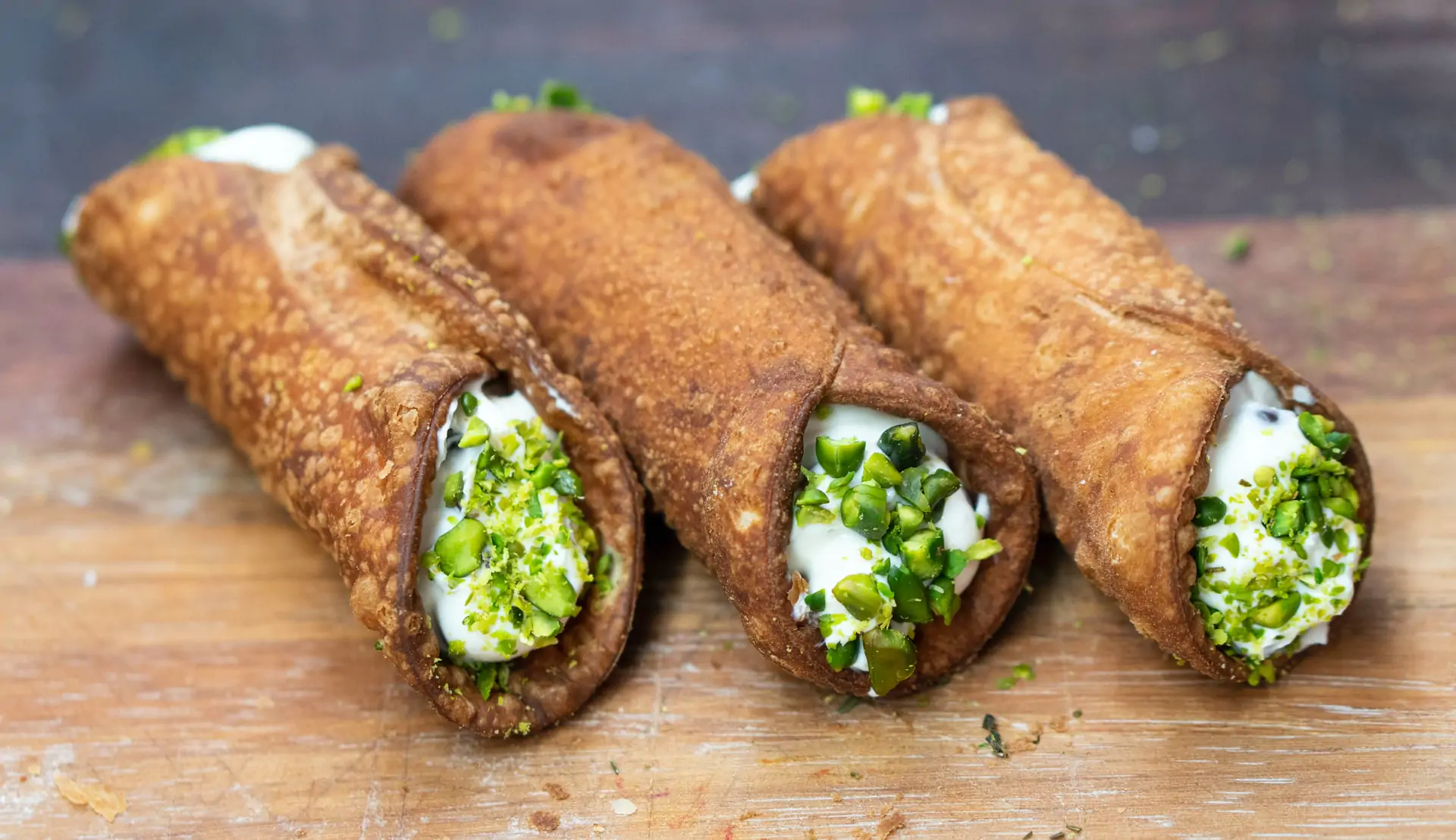 3. Farcite i cannoli con la mousse alla ricotta, aiutandovi con una sac à poche. Decorateli ai lati con la granella di pistacchi e serviteli subito