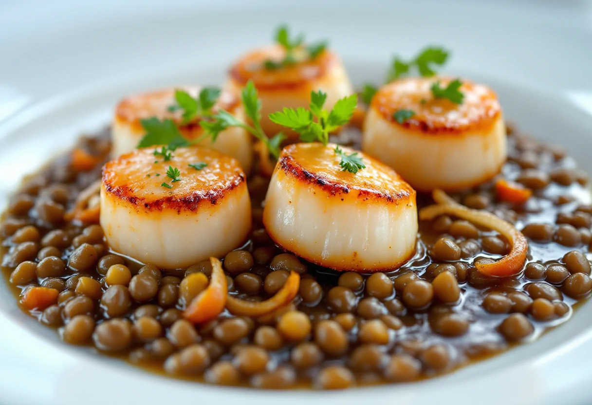 Scopri il sapore raffinato delle capesante gourmet con lenticchie e salsa al marsala.