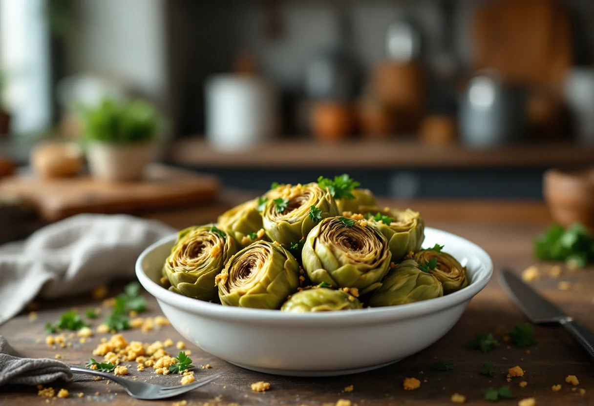 Iniziate rimuovendo le foglie più dure e la parte centrale, per ottenere il cuore del carciofo, che sarà farcito con una miscela di pane grattugiato, aglio, parmigiano e erbe aromatiche. Per un sapore più intenso, potete aggiungere anche caperi o acciughe. La gratinatura al forno permette ai carciofi di cuocere lentamente, amalgamando i sapori e creando una crosticina dorata e croccante.