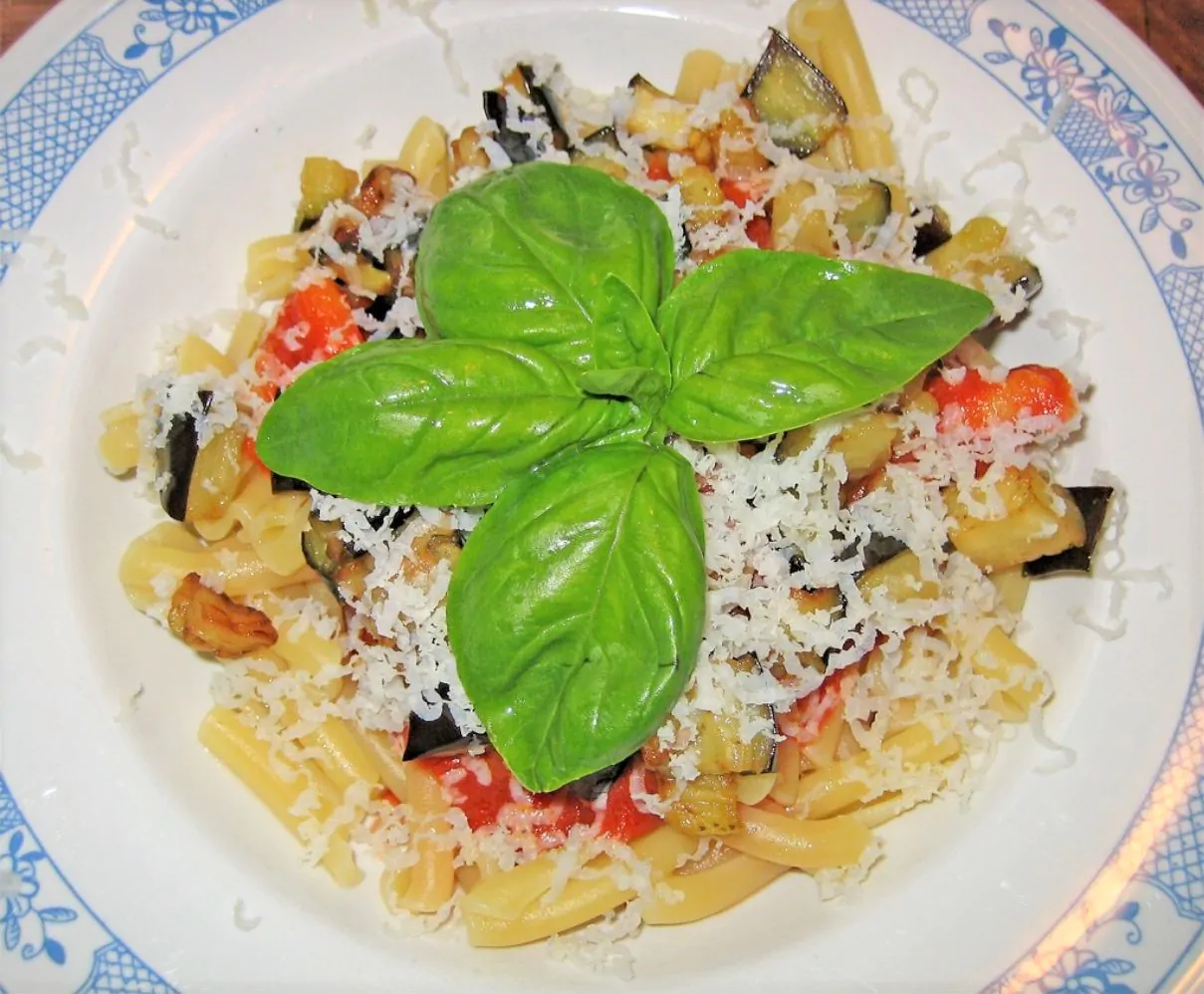 - Cuocete al dente le caserecce, conditele con la salsa di pomodoro e unite le melanzane fritte. Mescolate il tutto, aggiungete la ricotta salata grattugiata e guarnite ciascun piatto con del basilico fresco.