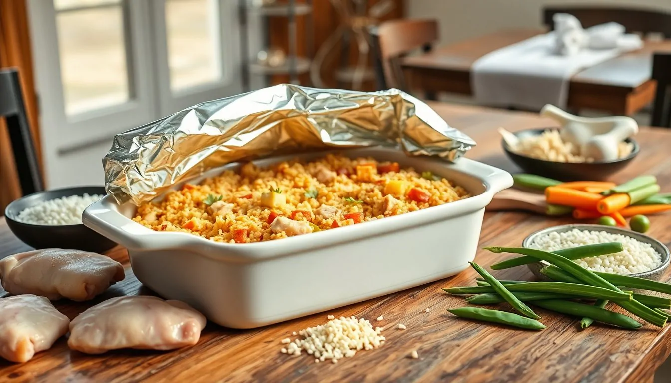Questo piatto unisce petto di pollo, riso istantaneo, una crema di zuppe e verdure, cotto sotto un foglio di alluminio che consente di mantenere umidità e sapore.