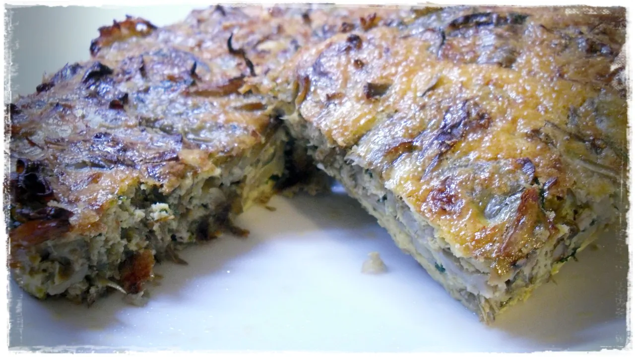 Far dorare uno spicchio di aglio con due cucchiai dii olio in una padella antiaderente, togliere l’aglio e far saltare i carciofi. Aggiungere un cucchiaino del composto di agli e prezzemolo tritati e lasciar cuocere per 15 minuti. Mettere un pizzico di pepe e di sale. Nel frattempo riscaldare il forno a 180°. Sbattere le uova ed aggiungere un pizzico di pepe ed il parmigiano grattugiato. Prendere una pirofila e sistemare la carta forno, adagiare i carciofi e coprire con le uova.