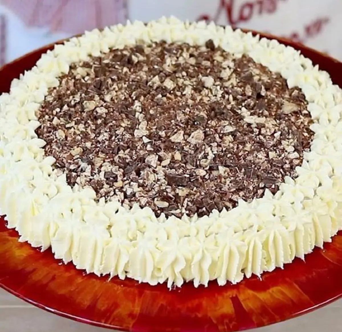 - Intanto, tritate grossolanamente il torrone che vi servirà come decorazione e montate il resto della panna a neve ben ferma. Trascorso il tempo necessario, riprendete la torta dal frigorifero e aprite delicatamente l’anello. Con la lama liscia di un coltello, staccate delicatamente i bordi facendo attenzione a non rovinare la torta. Prendete la granella di torrone e distribuitela al centro a cerchio.