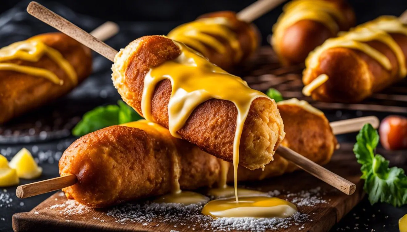 - Immergere. Tieni il bastone e immergi gli hot dog, ricoprendoli completamente, assicurandoti che la pastella sia aderente all’hot dog e al formaggio.