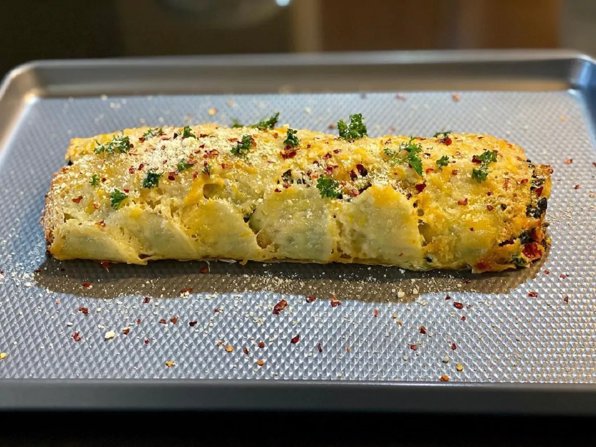 14. Una volta che è completamente arrotolato, mettere il rotolo di patate sulla carta pergamena e cuocere per 15 minuti.
