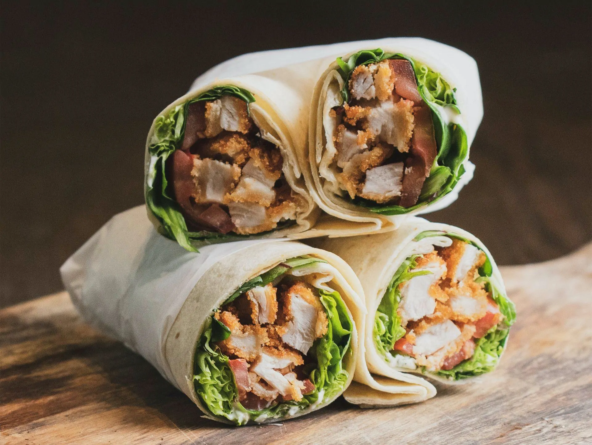 - Scaldate i coni di piadina in forno per 10 minuti a 180°, sfornateli non appena appaiono abbrustoliti e lasciateli intiepidire. Intanto preparate il pollo impanato e tagliatelo a striscioline.