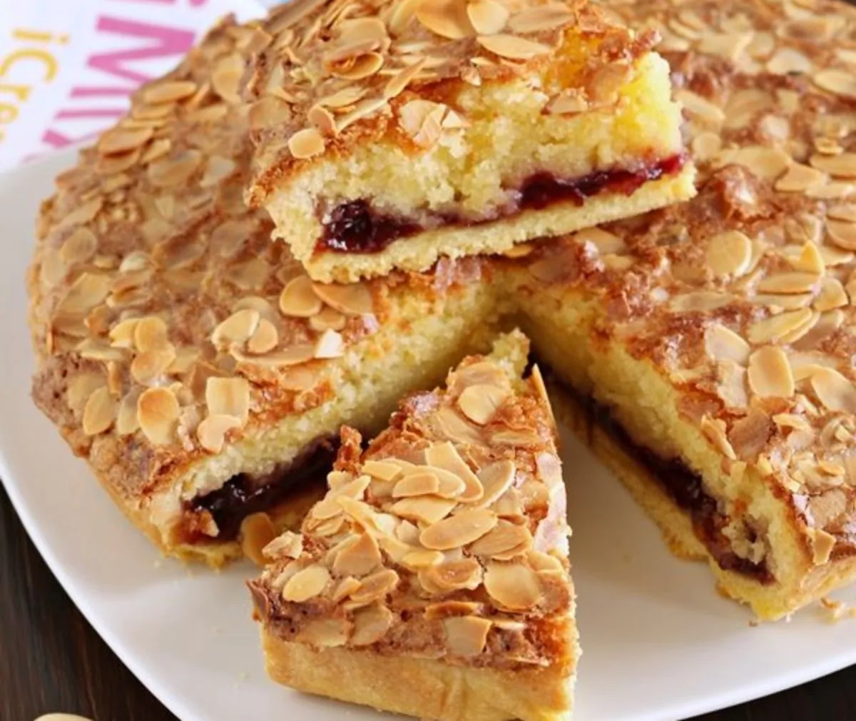- Stendete la frolla a circa 4 mm e foderate lo stampo. Bucherellate il fondo di frolla con una forchetta e ricopritelo con uno strato di marmellata poi delicatamente versate la crema fino a raggiungere il bordo della pasta. Cospargete le mandorle a lamelle sulla superficie.