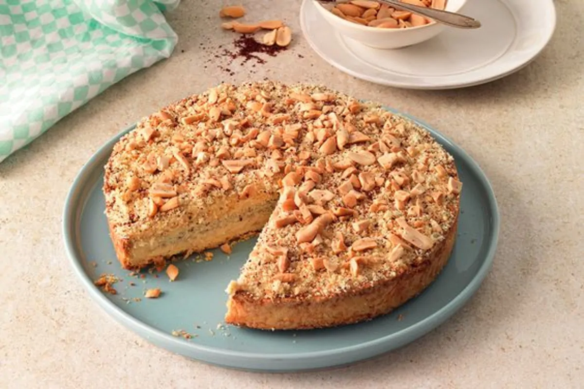 - Frullate i ritagli di pan di Spagna e distribuiteli sulla superficie della torta aggiungendo a piacere qualche arachide.