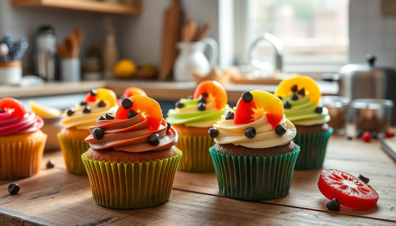 Morbidi e golosi, i cupcake con gocce di cioccolato e decorati con rotelle di frutta sono ideali per compleanni, feste di bambini o semplicemente per una merenda colorata. La combinazione di un impasto ricco di cioccolato con una decorazione vivace e gioiosa li rende davvero irresistibili. Prepararli è semplice e divertente, e il risultato è un dolce che mette subito di buon umore.