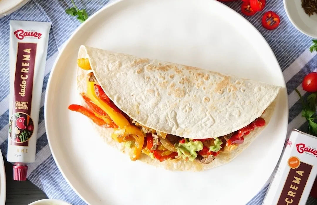 Farcisci le tortillas con carne, peperoni e salsa guacamole.