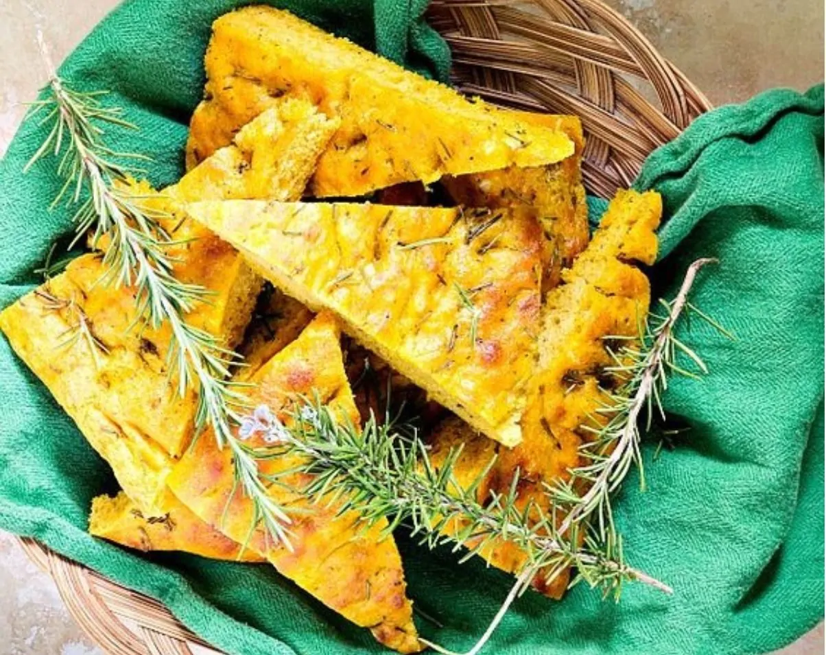 La focaccia di zucca senza lievito è una soffice e invitante schiacciata dal sapore e profumo aromatico, ottima da servire in autunno come antipasto o come sfizioso stuzzichino durante un aperitivo. La ricetta che vi proponiamo è semplicissima e veloce da preparare in quanto non richiede lunghe ore di lievitazione. In alternativa al lievito istantaneo abbiamo utilizzato una miscela di cremor tartaro e bicarbonato, che garantiscono un’ottima e leggera lievitazione.