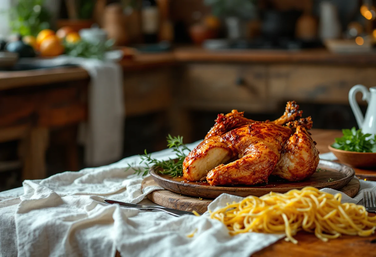 Scopri il sapore del galletto al forno con agretti, un piatto primaverile da non perdere.