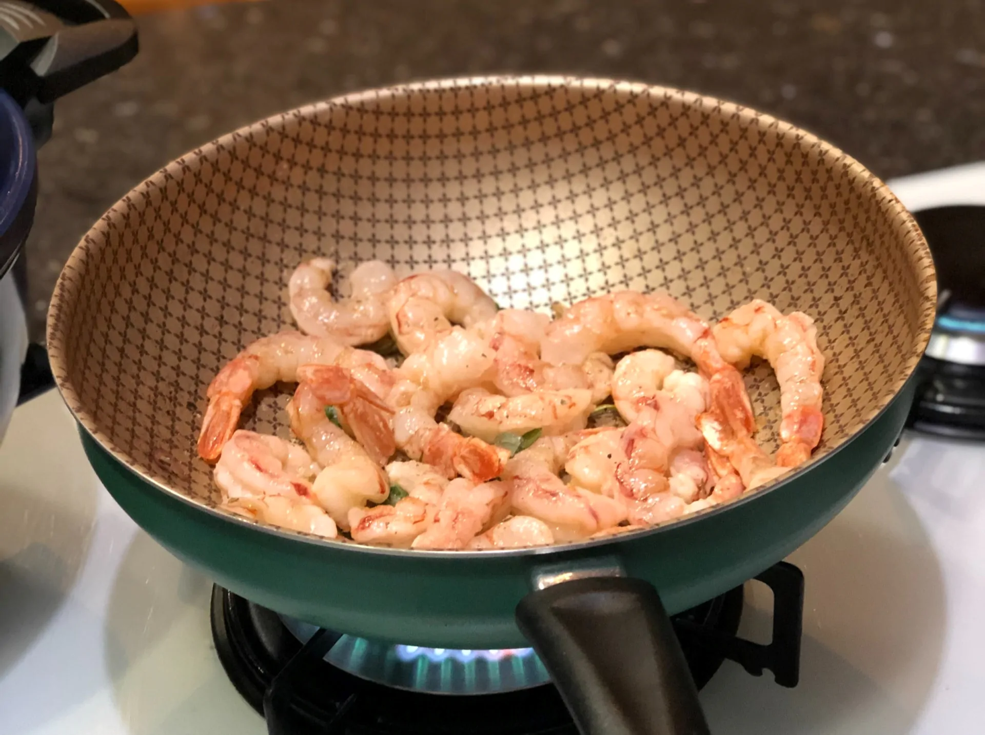 1. Fate insaporire un filo d’olio extravergine d’oliva in padella con gli spicchi d’aglio schiacciati, dopodiché unite le code di gambero e fatele rosolare a fuoco vivace per alcuni minuti.