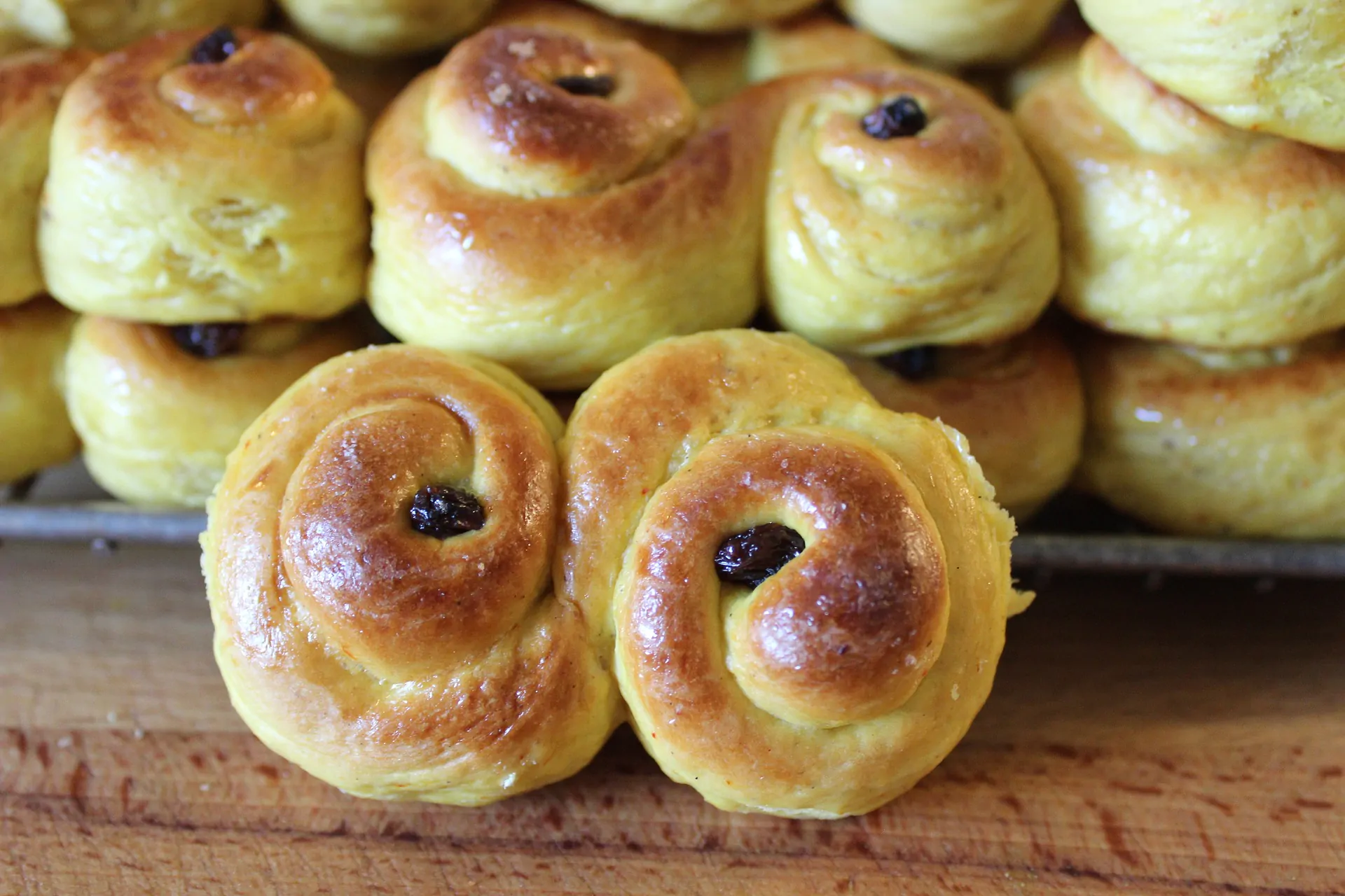 I Gatti di Santa Lucia sono dei tradizionali dolcetti tipici della cucina svedese, preparati con una soffice pasta brioche al burro e decorati con due chicchi di uva sultanina. In Svezia è usanza preparare questi dolcetti il 13 dicembre, in onore di Santa Lucia. Il nome originale di queste brioche è Lussekatten, in riferimento a un antico racconto, secondo cui Lucifero approfittasse della notte più lunga dell’anno per assumere le sembianze di un gatto e impaurire i bambini, che potevano difendersi grazie a dolcetti dorati, simbolo di luce.