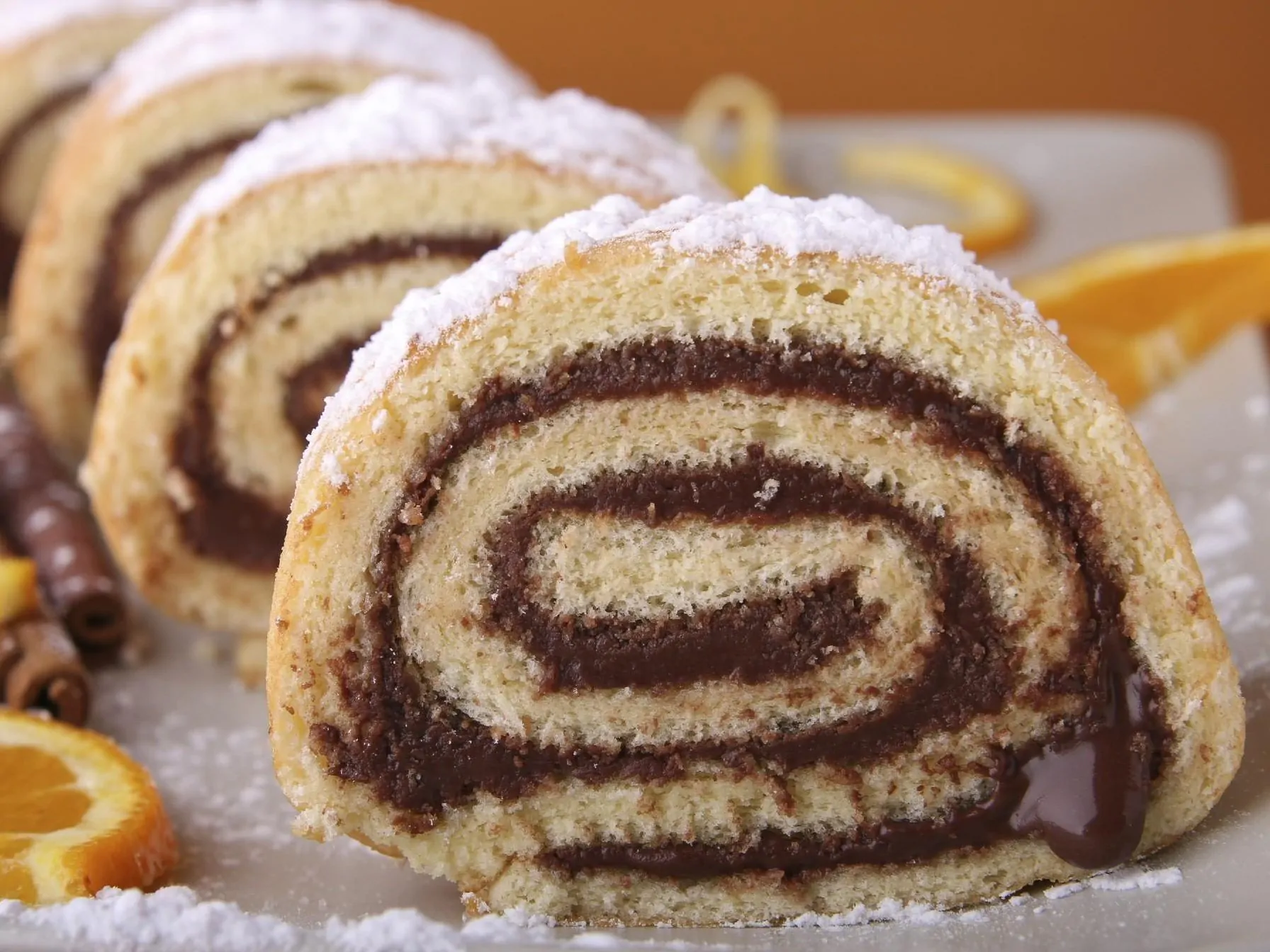 - Tagliate ogni rotolo farcito con un coltello a lama liscia, così da ottenere delle girelle spesse 3 cm, dopodiché intingetele da un solo lato nel cioccolato fondente sciolto a bagnomaria.