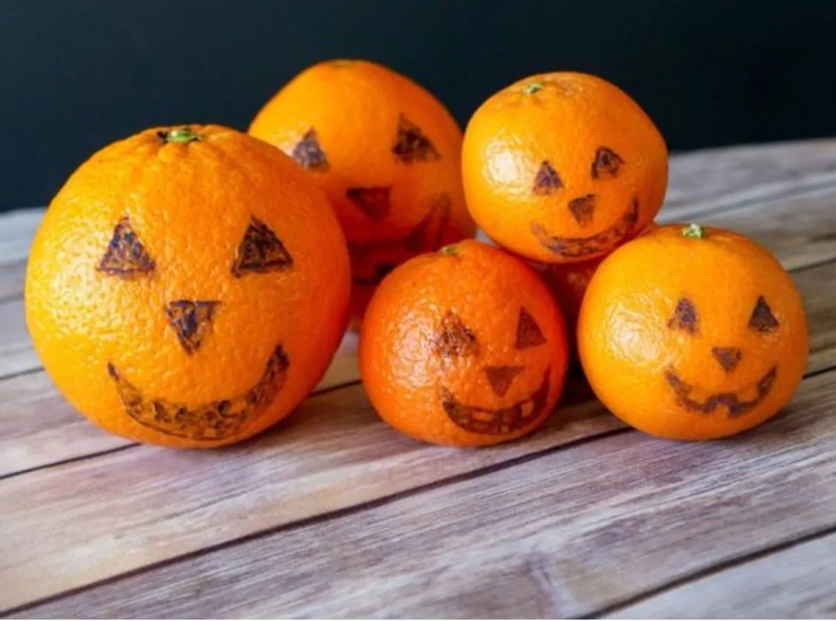 - Versate la crema pasticcera all’interno di una ciotola, copritela con la pellicola trasparente e lasciatela raffreddare. Intanto decorate i mandarini a tema Halloween, incidendo la buccia con un taglierino.