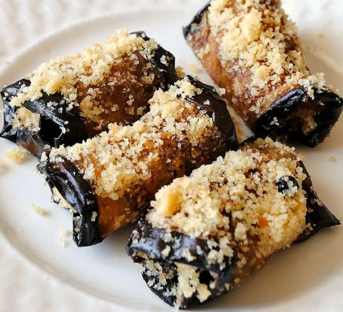 - Scaldate una piastra e, una volta calda, adagiate le fette di melanzane e grigliatele da entrambi i lati fino a che non saranno morbide e non presenteranno le tipiche striatur. Una volta terminata la cottura delle melanzane, adagiatele su un tagliere e distribuite sopra la panatura precedentemente preparata. Farcite con l’uvetta e avvolgete le melanzane dal lato corto per creare un rotolino, fermando le estremità con uno stuzzicadenti.