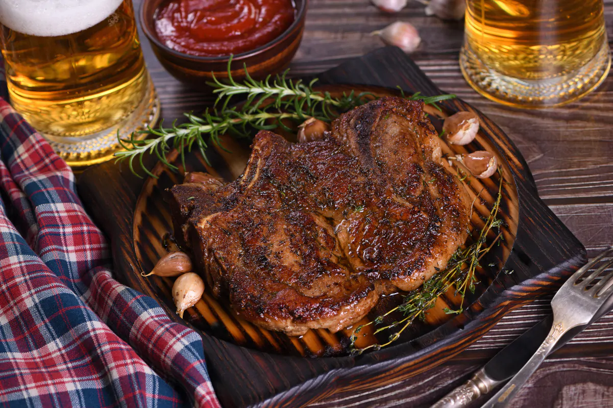 Roasted pork chop on the bone steak.The meat is served on a wooden plate with rosemary and thyme, fried garlic.