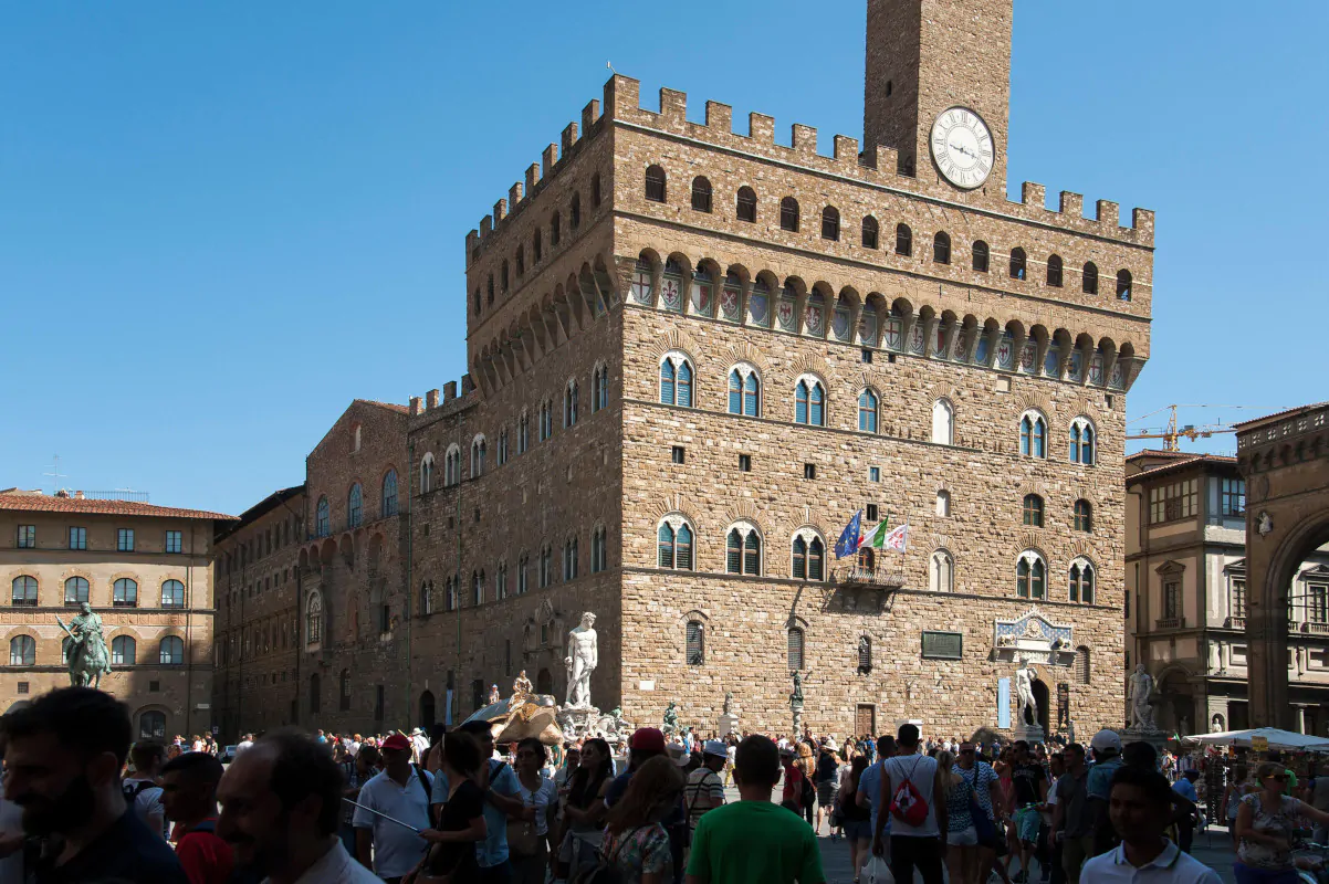Romanesque Palazzo Vecchio by Arnolfo di Cambio on Piazza della Signoria in Historic Centre of Florence listed World Heritage by UNESCO in Florence, T