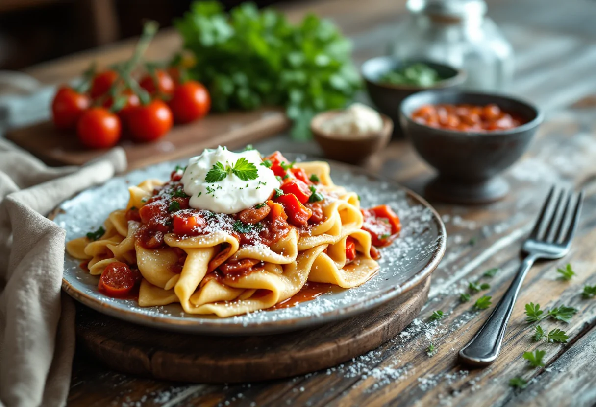 Per assemblare le millefoglie, è consigliabile farlo all’ultimo momento, direttamente nei piatti. Iniziate alternando uno strato di pane guttiau con uno di spuma di ricotta e uno di ragù di verdure. Continuate fino a esaurire gli ingredienti, creando un effetto scenografico e invitante. Servite subito, accompagnando il piatto con un filo d’olio extravergine di oliva e, se desiderate, una spolverata di pepe nero.