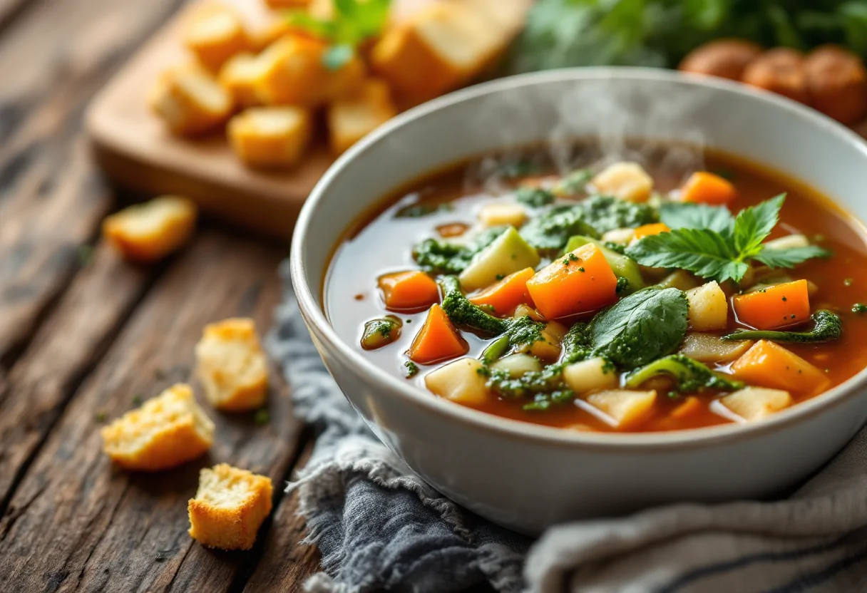 Scopri il nostro minestrone di verdure con pesto e crostini, un piatto ricco di sapore e salute.
