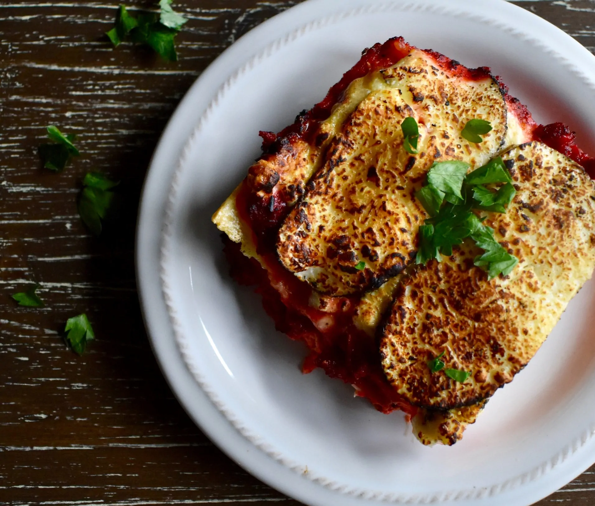 - Create dei nuovi strati di verdure fritte e ragù di lenticchie, fino a terminare gli ingredienti a disposizione. Ultimate la preparazione aggiungendo in superficie la besciamella e parmigiano.