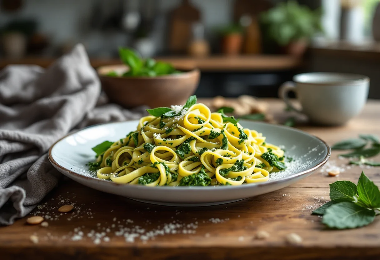 Scopri il sapore unico delle pappardelle al pesto di salvia con mandorle.