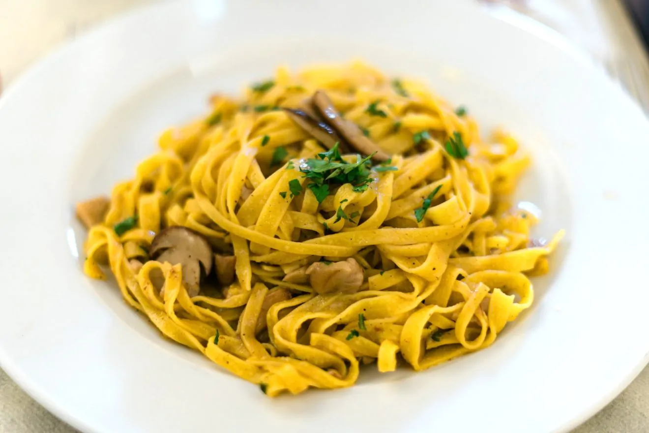 - Proseguite la cottura dei funghi per una decina di minuti e nel frattempo cuocete le tagliatelle senza uova nell’acqua salata aromatizzata con una bustina di zafferano e un pizzico di curcuma.