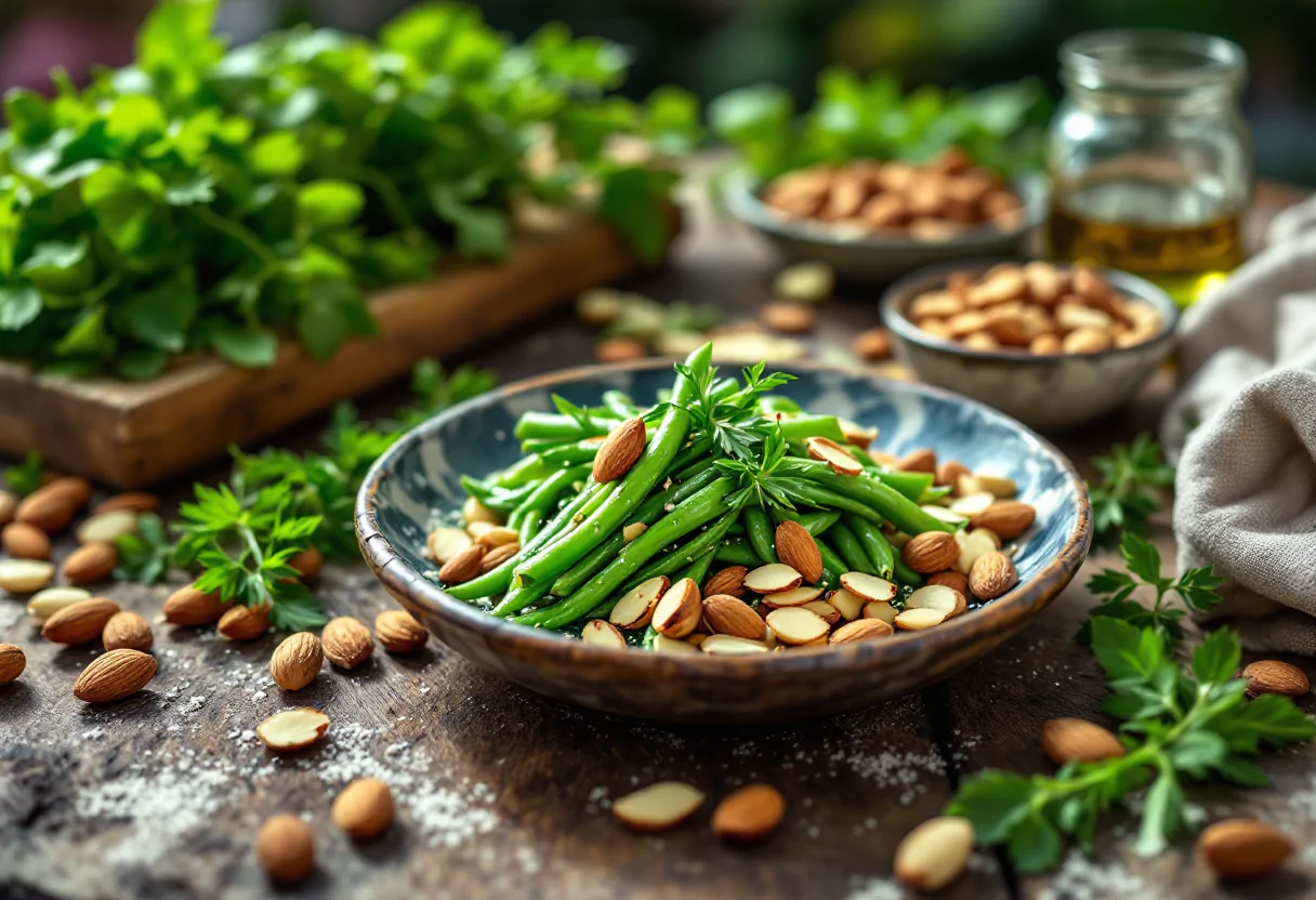 Il pesto di fagiolini e mandorle è una preparazione che unisce la freschezza degli ingredienti mediterranei a un sapore avvolgente e cremoso. Per realizzarlo, avrai bisogno di fagiolini freschi, mandorle, basilico, olio extravergine d’oliva, aglio e formaggio. La scelta delle mandorle al posto dei tradizionali pinoli conferisce al pesto una dolcezza particolare, rendendolo ideale per accompagnare piatti estivi.