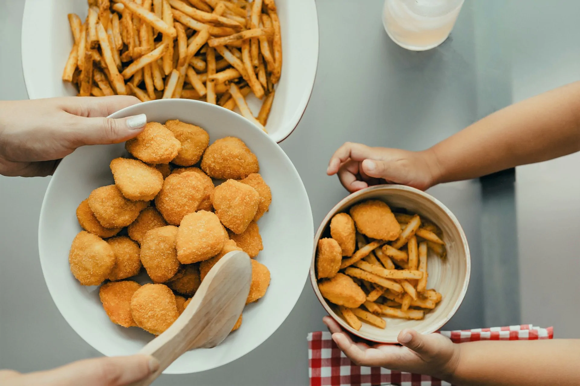 - Scolate le patate e tamponatele accuratamente con un canovaccio. Scaldate abbondante olio di arachidi all’interno di due padelle e friggete separatamente le patate e i bocconcini di pollo.