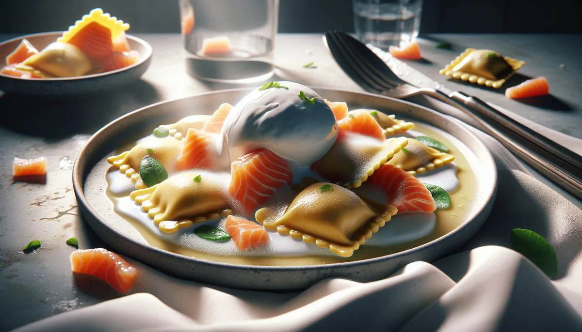 La ricetta prevede l’uso di farina, uova, salmone affumicato, ricotta, lime e burrata. La preparazione inizia con l’impasto della pasta fresca, che deve riposare per garantire una consistenza perfetta. Una volta stesa la pasta, si procede a creare i dischi per i ravioli, farciti con un ripieno cremoso di ricotta e salmone, insaporito con lime e aneto. La chiusura dei ravioli è un momento cruciale: è importante sigillare bene i bordi per evitare che il ripieno fuoriesca durante la cottura.