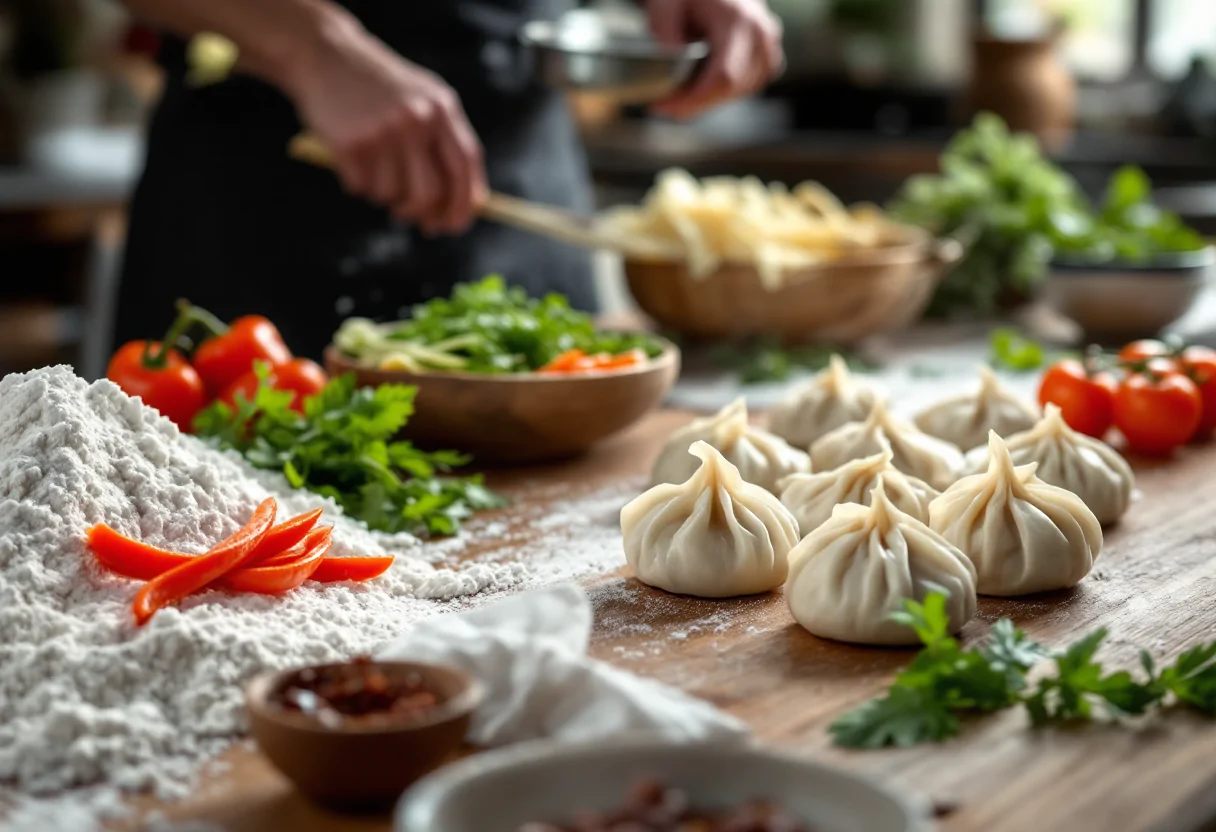 Iniziate preparando la pasta: in una ciotola, mescolate la farina con l’acqua e un pizzico di sale. Impastate energicamente fino a ottenere un panetto liscio e omogeneo. Avvolgetelo nella pellicola e lasciatelo riposare per almeno un’ora. Nel frattempo, dedicatevi al ripieno: tritate finemente la carota, il cavolo cinese e il cipollotto, quindi unite la carne tritata. Condite con zenzero fresco grattugiato e salsa di soia, lasciando insaporire per circa 30 minuti.