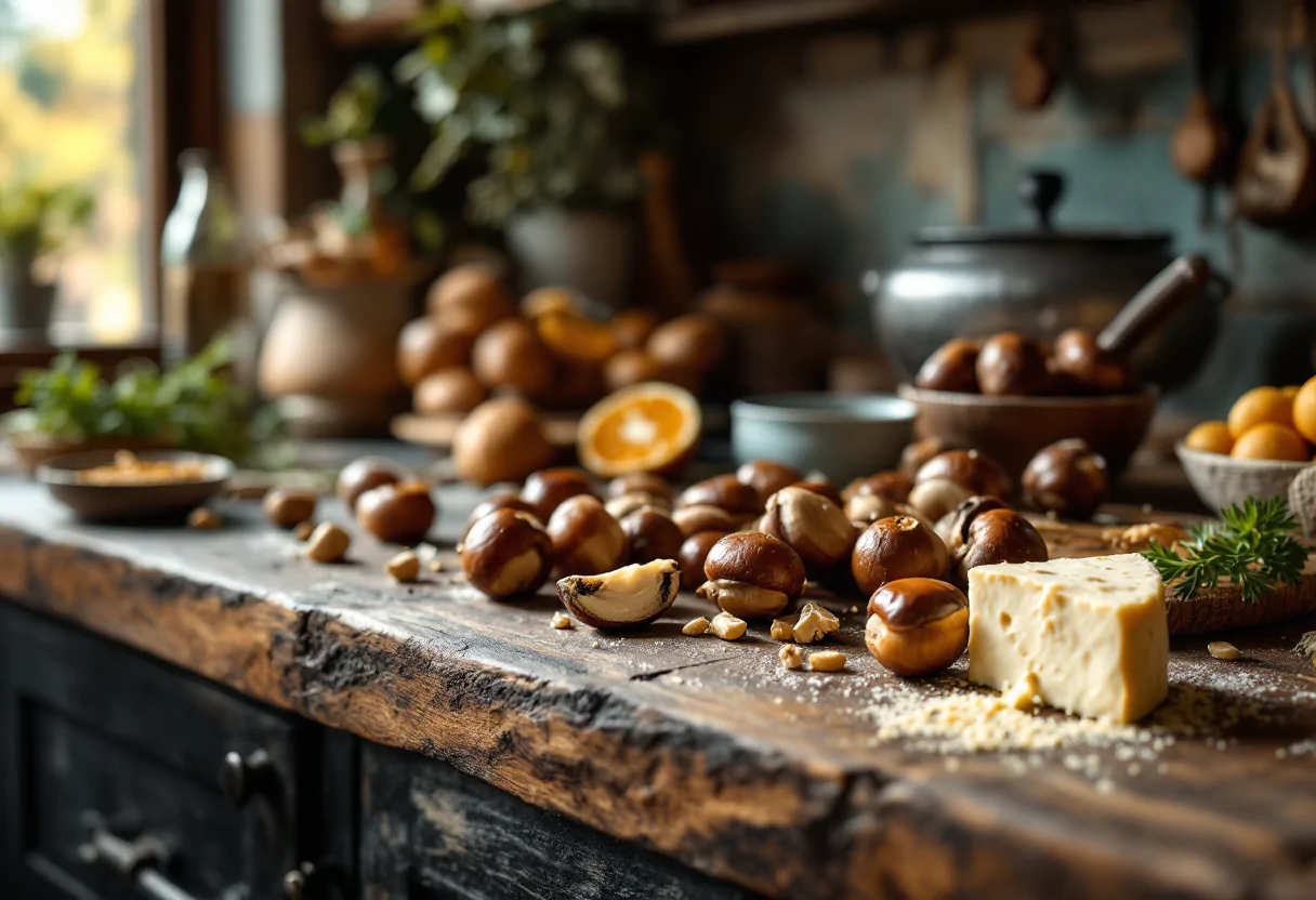 Iniziamo la preparazione di questo piatto ricco di sapori. Per prima cosa, incidi le castagne e cuocile in forno fino a quando non saranno tenere.