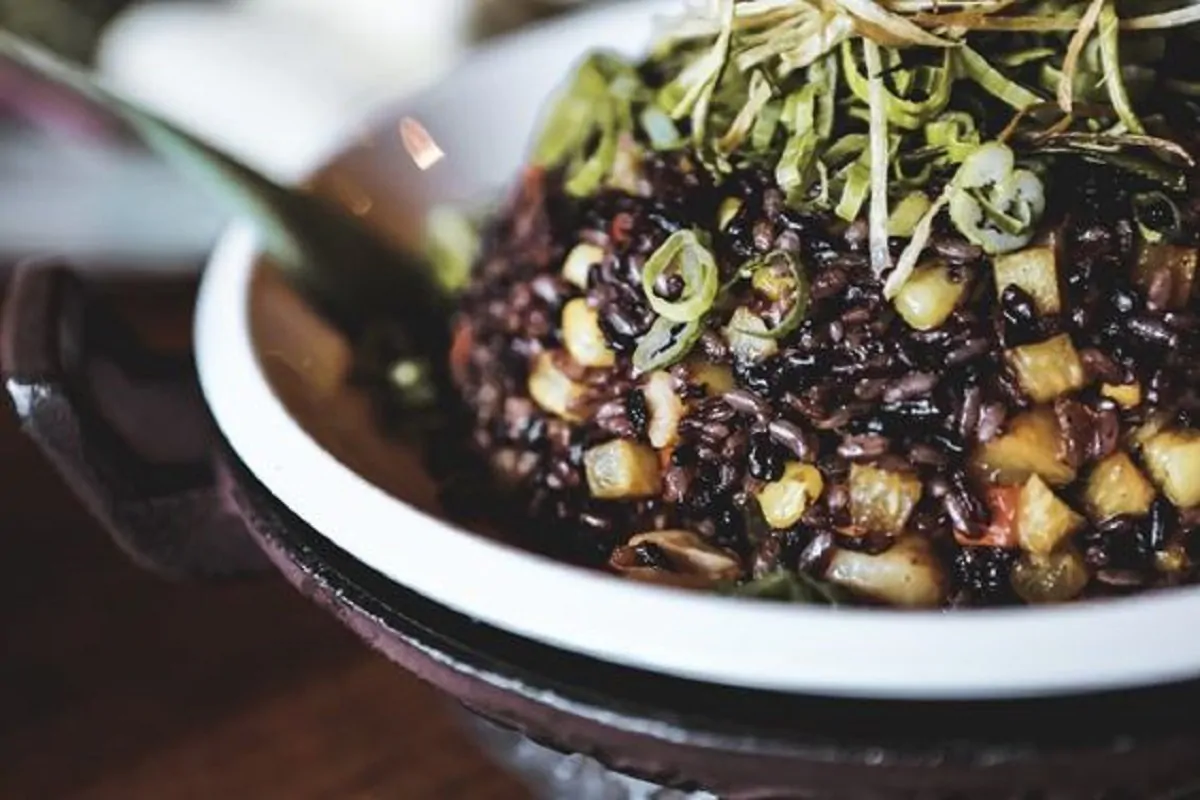 - Intanto cuociamo il riso venere in acqua bollente salata. Una volta cotto lo scoliamo e lo condiamo con un filo d’olio.