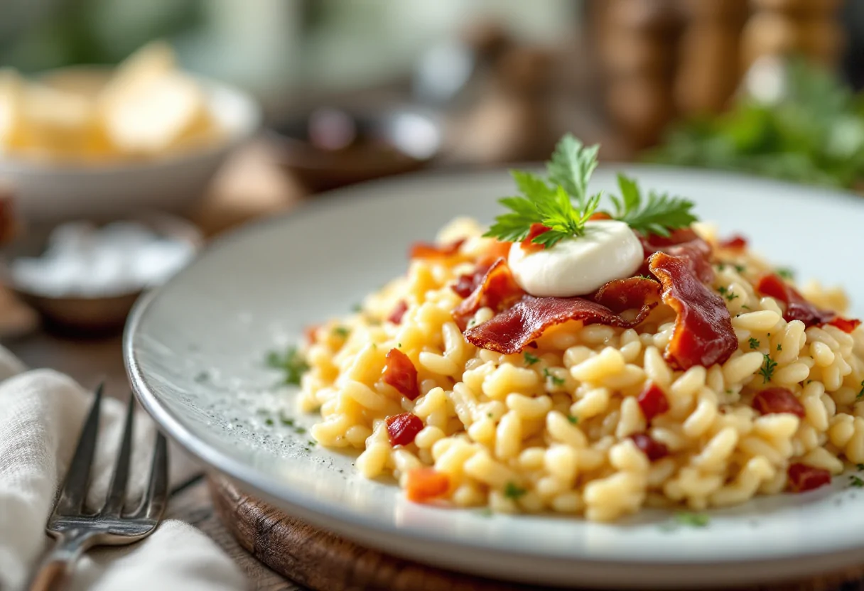 Scopri il risotto al burro acido, un piatto gourmet con burrata e speck.