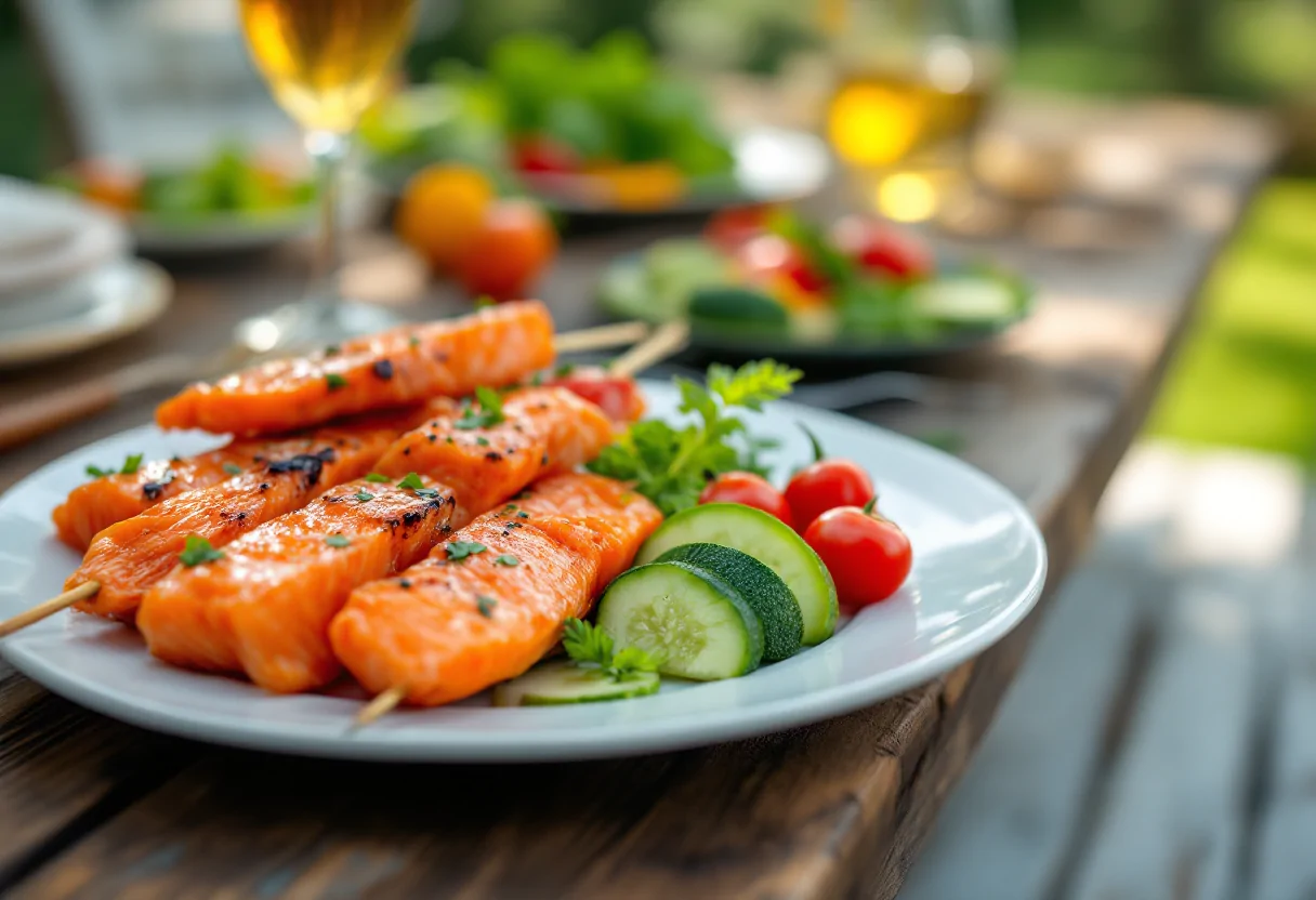 Riscalda la griglia o il barbecue e cuoci gli spiedini per circa 10-15 minuti, girandoli di tanto in tanto. La cottura alla griglia permette al salmone di rimanere succoso, mentre le verdure si abbrustoliscono, acquisendo un sapore affumicato che arricchisce il piatto.
