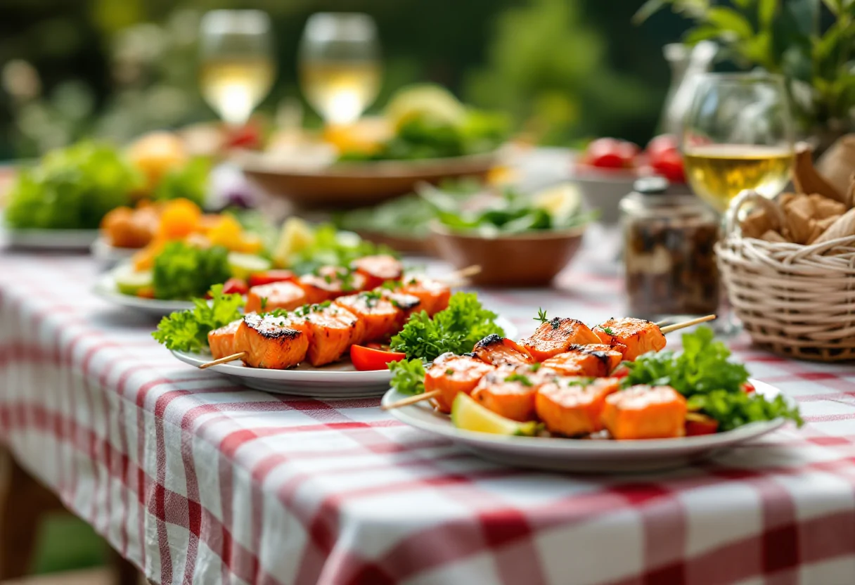 Deliziosi spiedini di salmone e verdure, perfetti per l'estate.