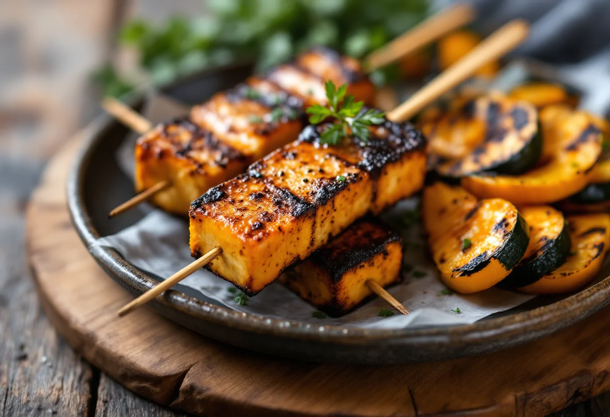 Scopri la bontà degli spiedini di tofu affumicato e zucca, un piatto vegetale ricco di sapore.
