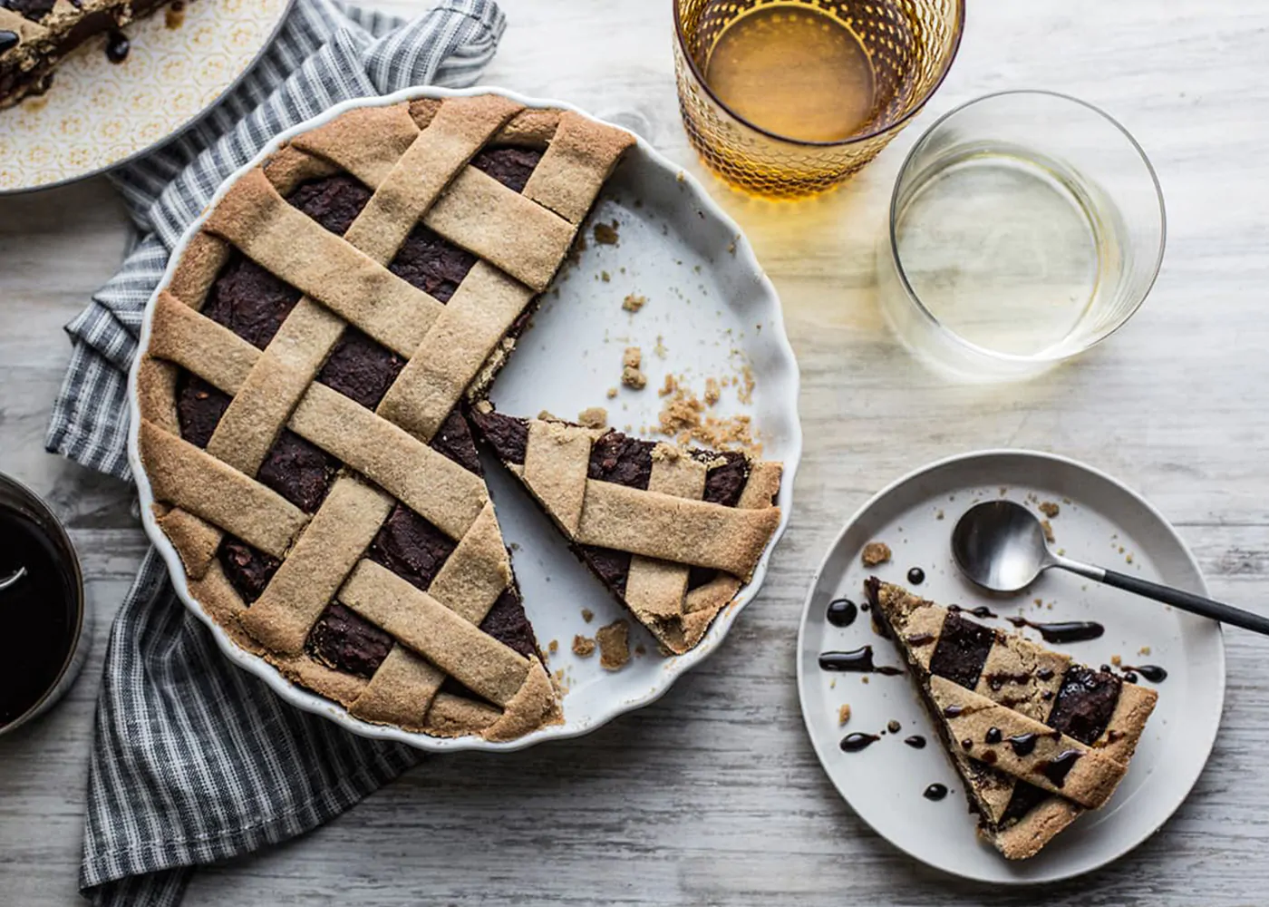 - Farcite la crostata con la crema di riso e cioccolato, livellatela con una spatola e decorate la superficie con una griglia di losanghe di frolla.