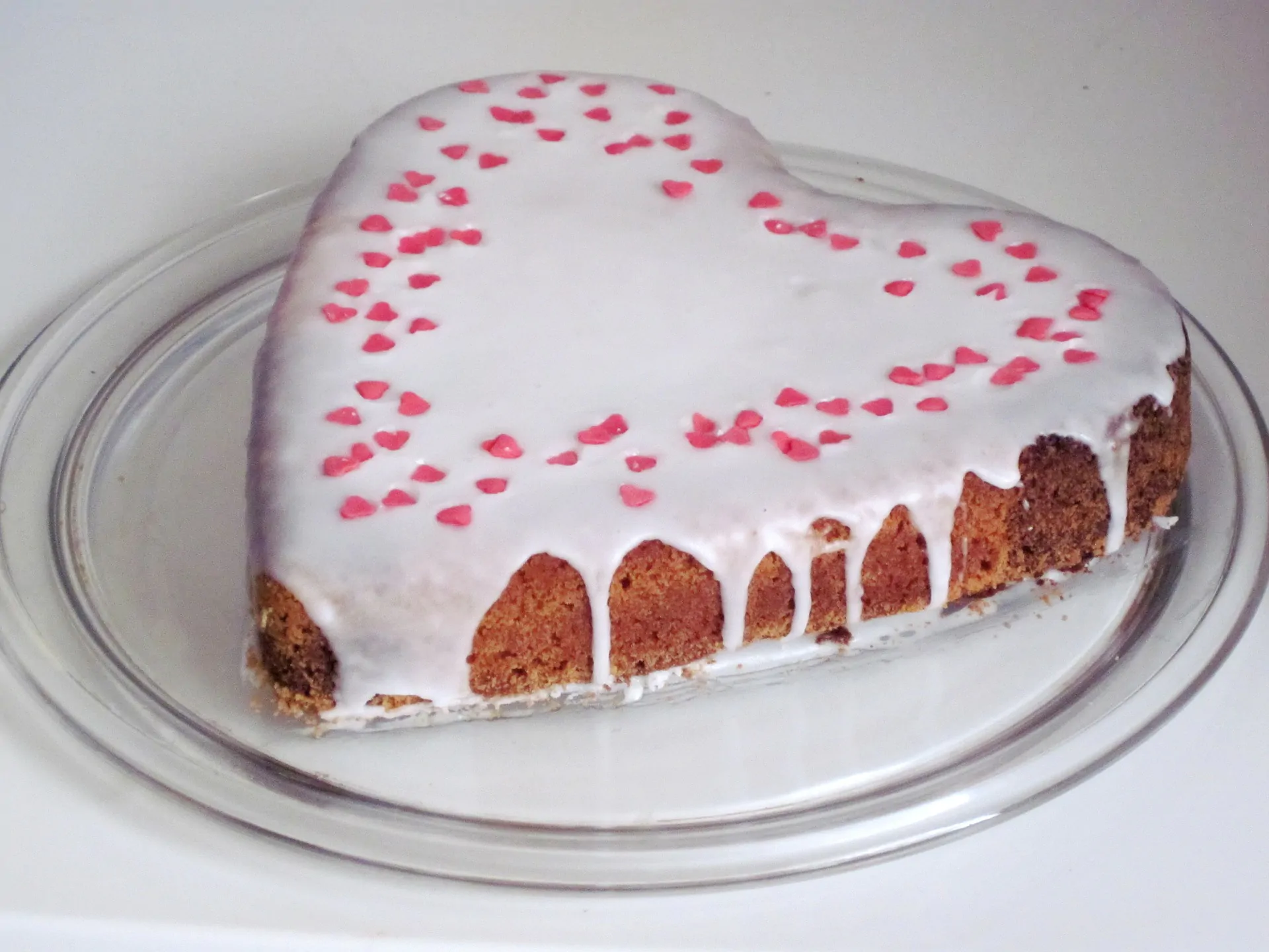 5. Glassate la torta a forma di cuore e decoratela con gli zuccherini. Lasciate asciugare la glassa prima di servirla.