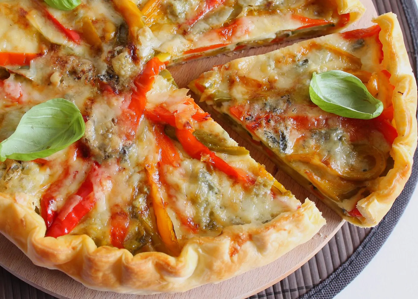 - Farcite la torta con il ripieno di peperoni e stracchino, ripiegate i lembi esterni della sfoglia verso l’interno e cuocete la quiche per circa 35 minuti nel forno statico preriscaldato a 180°.