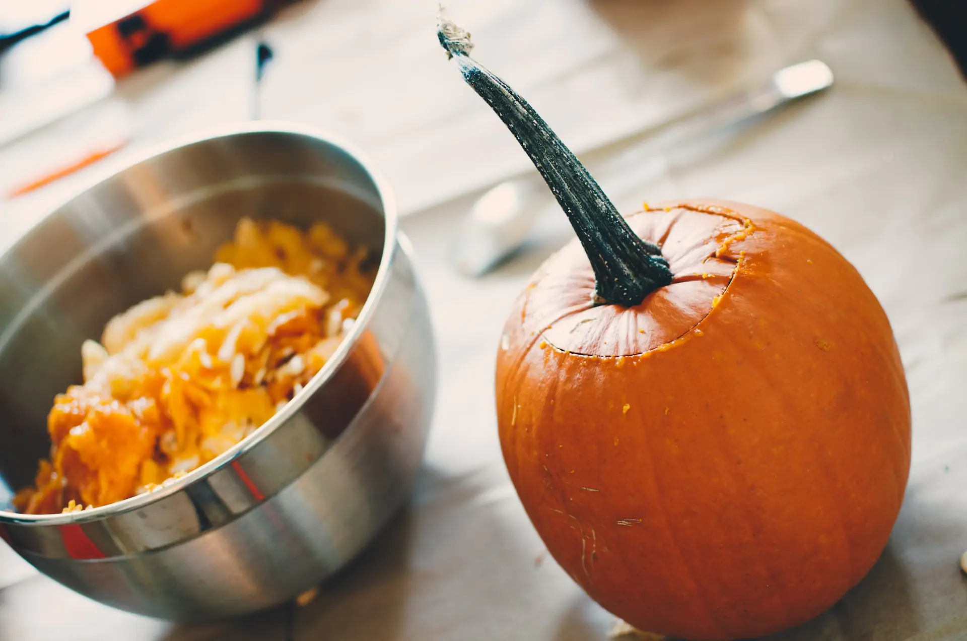 - Lavate la zucca, asciugatela e tagliate la calotta superiore, dopodiché scavatela con attenzione con un coltello. Pulite la polpa eliminando i semi e i filamenti, dopodiché tagliatela a cubetti piccoli.