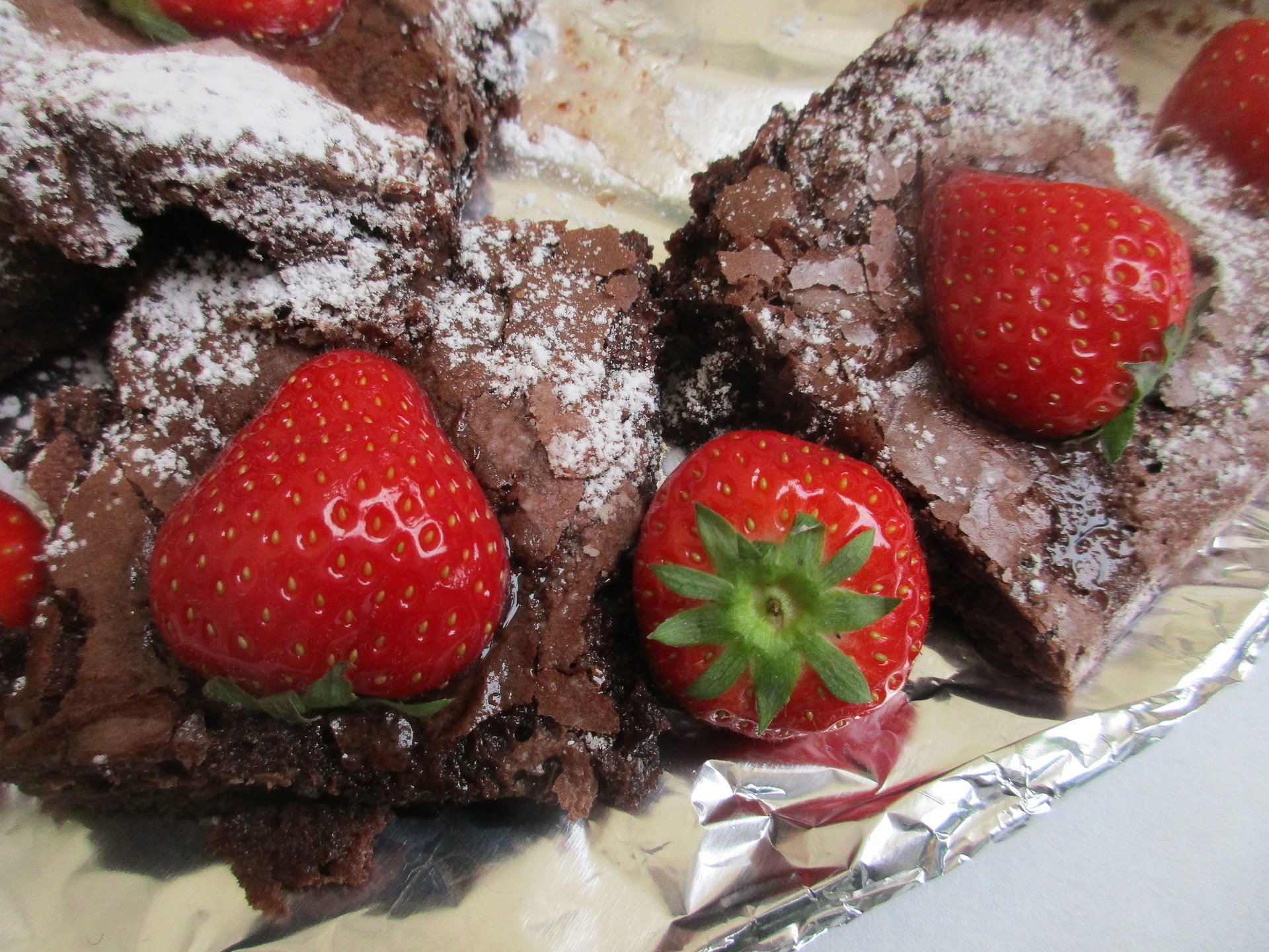 - Una volta fredda, tagliatela in tanti brownies quadrati e guarnite ciascuno di essi con zucchero a velo e fragole fresche intere o tagliate a fettine.