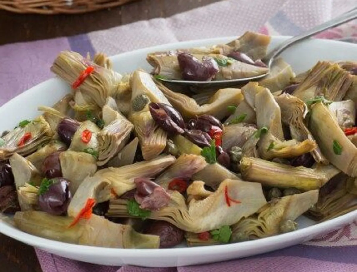 1. Per prima cosa dissalate i capperi sciacquandoli accuratamente sotto acqua corrente. Poi passate alle olive, togliendo il nocciolo centrale e sbucciandole con un coltellino o con lo snocciolatore. Passate, poi, alla pulizia dei carciofi. Dopo aver tolto il gambo e le foglie più esterne fino a raggiungere le più tenere, sbucciate la base, quindi tagliate nettamente parte delle foglie. Dividete a metà, togliete la barbetta con uno spelucchino e dividete in 8 spicchi dividendo a metà e ancora. Man mano immergete i pezzi in acqua e limone per non farli annerire.